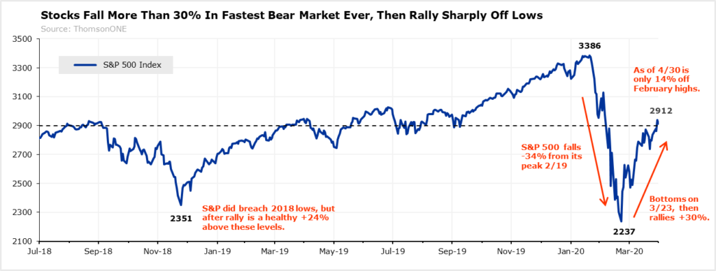 With the current health and economic environments seemingly in a constant state of flux as of late, we thought we would share a helpful market update and excerpt from our recent client notice.  Kindly note that the data in this commentary is as of April 30th and should be read as such.  Our investment team is available to expound on any of the topics covered in this commentary or market events that may have occurred since the time of the writing.